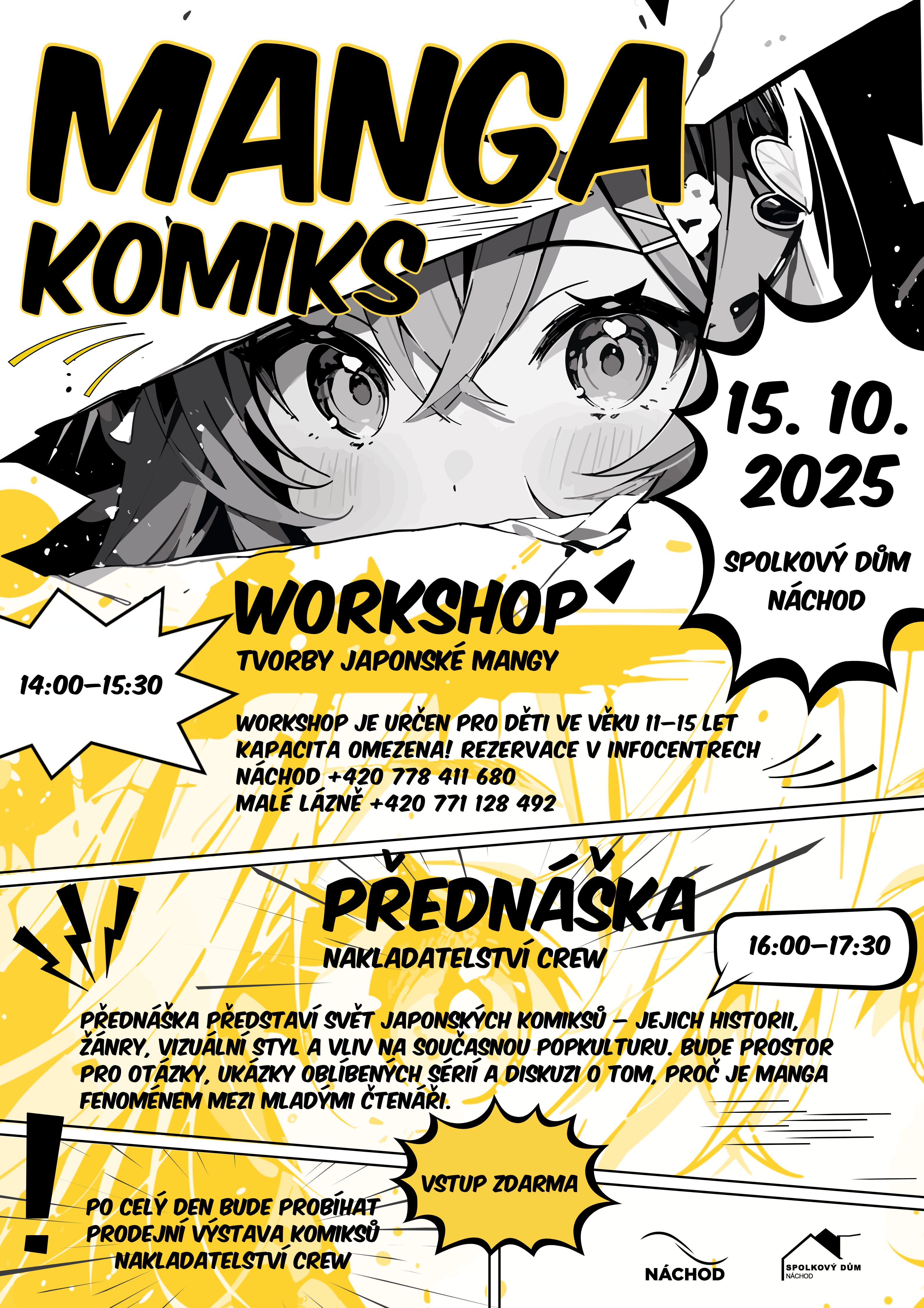 Přijďte na workshop tvorby japonské mangy, který se uskuteční ve středu 15. října 2025 ve Spolkovém domě a je určen pro děti od 11 do 15 let.