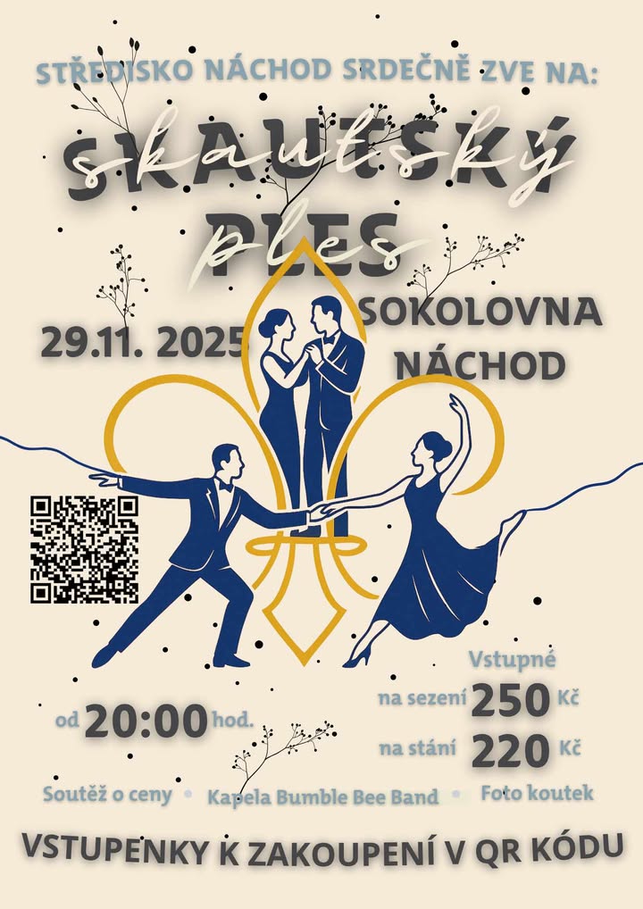 Junák - český skaut, středisko Náchod, z. s. vás srdečně zve v sobotu 29. listopadu 2025 od 20:00 na Náchodský skautský ples, který se uskuteční v Sokolovně Náchod.