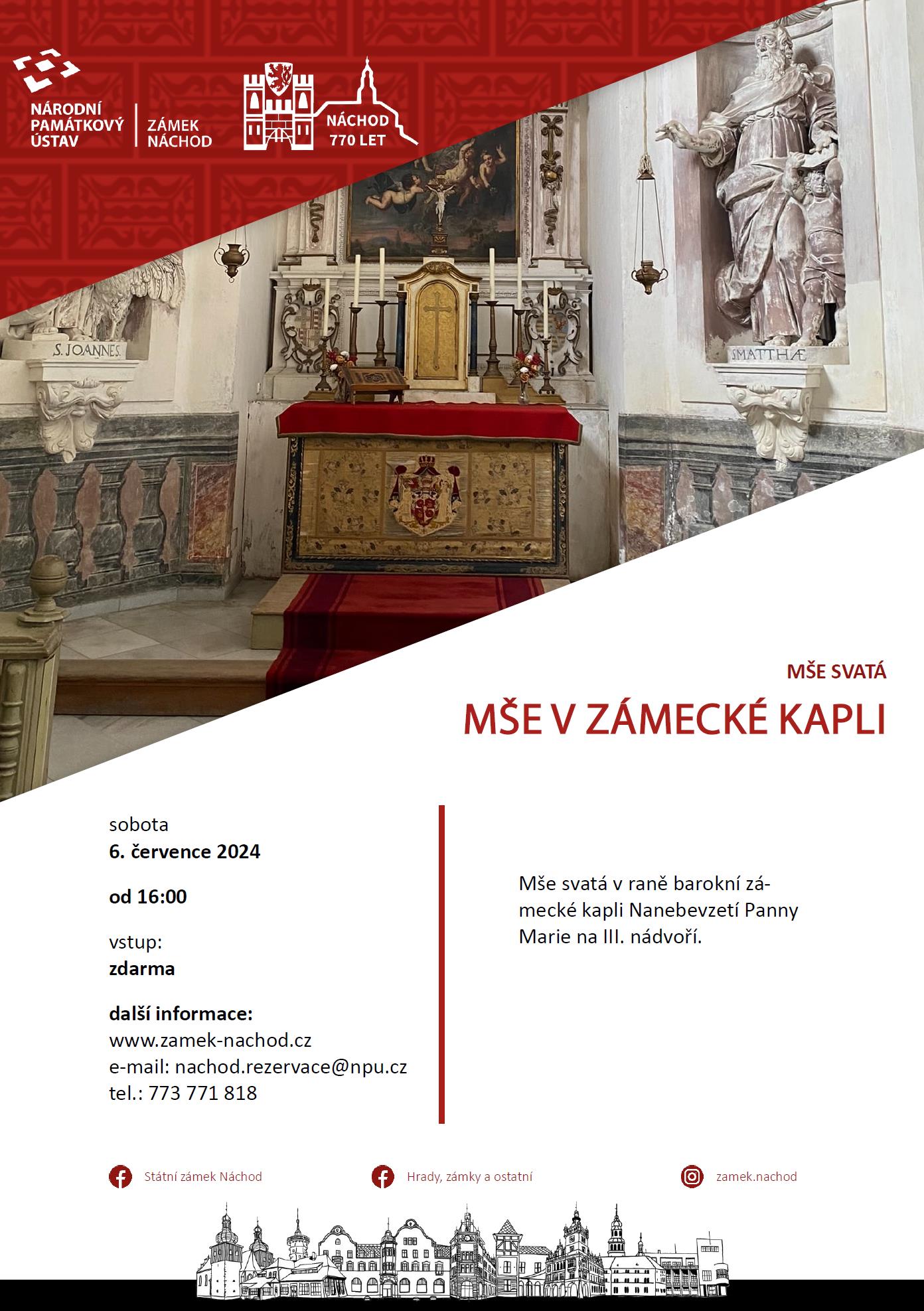 V sobotu 6. července se od 16 hodin uskuteční v zámecké kapli Nanebevzetí Panny Marie mše svatá (III. nádvoří Státního zámku Náchod).