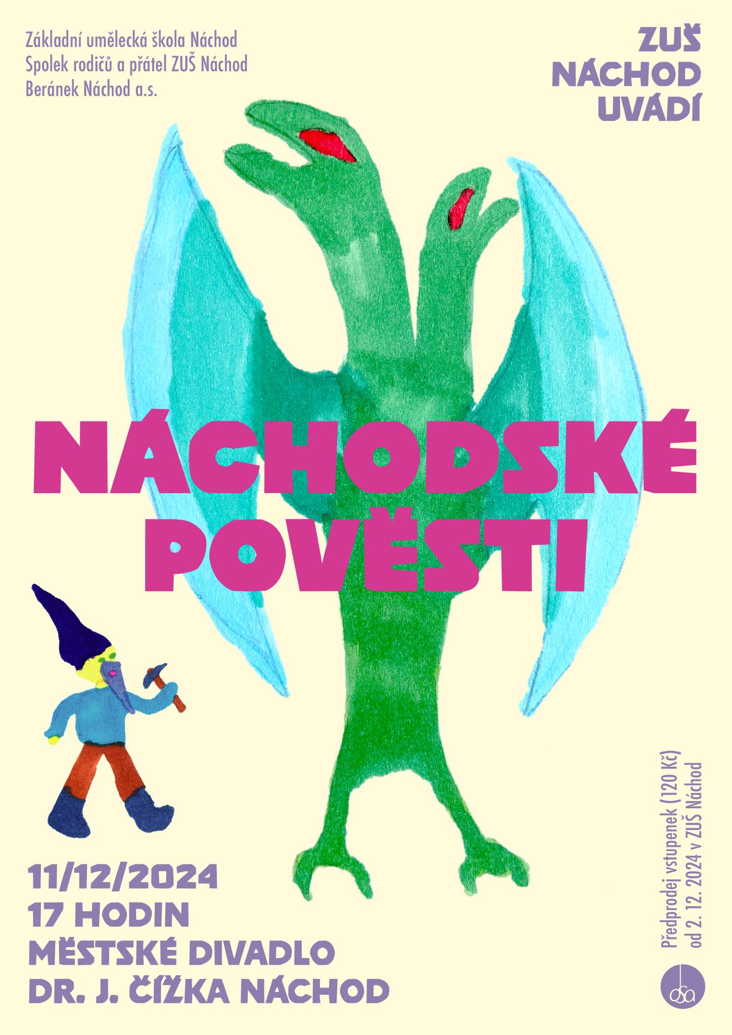 Literárně - dramatický obor pro vás připravil čtyři místní pověsti. Užijete si jak ty historické, které zobrazují část místních dějin (Vyhnání Koldy z Náchoda), tak ty, které se skoro blíží pohádkám, protože se v nich objevují bludičky, vodníci, permoníci či čarodějnice (Zlatá skála na Dobrošově).
