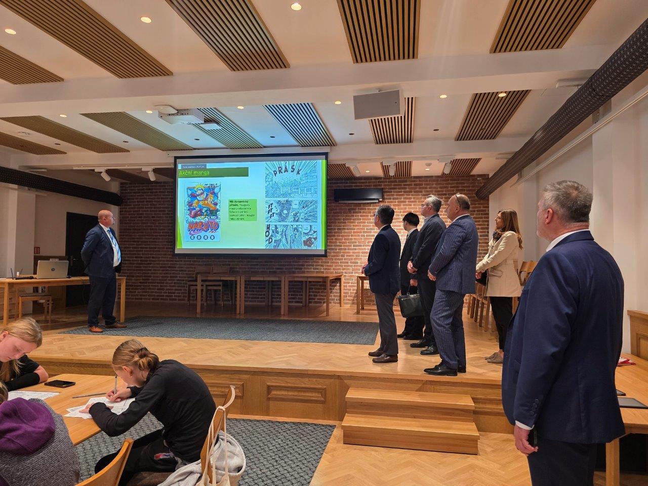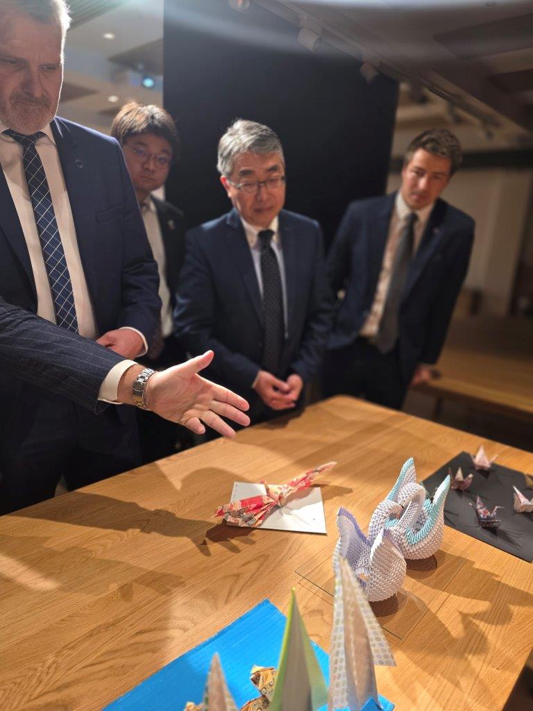 Na závěr své návštěvy si pan velvyslanec prohlédl soutěžní práce v rámci origami soutěže a osobně vybral vítězný výtvor, jehož autor obdrží Čestnou cenu velvyslance Japonska.