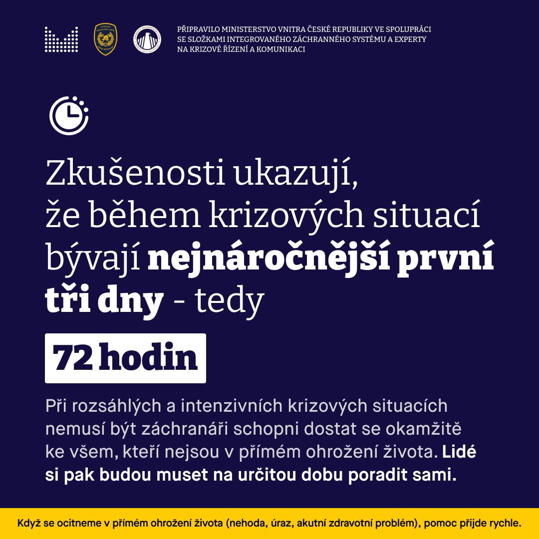 Někdy i malá příprava může zachránit život. Pro tyto účely vznikl praktický manuál „72 hodin", který radí, jak se postarat o sebe a své blízké během prvních tří kritických dnů krize, než dorazí organizovaná pomoc.