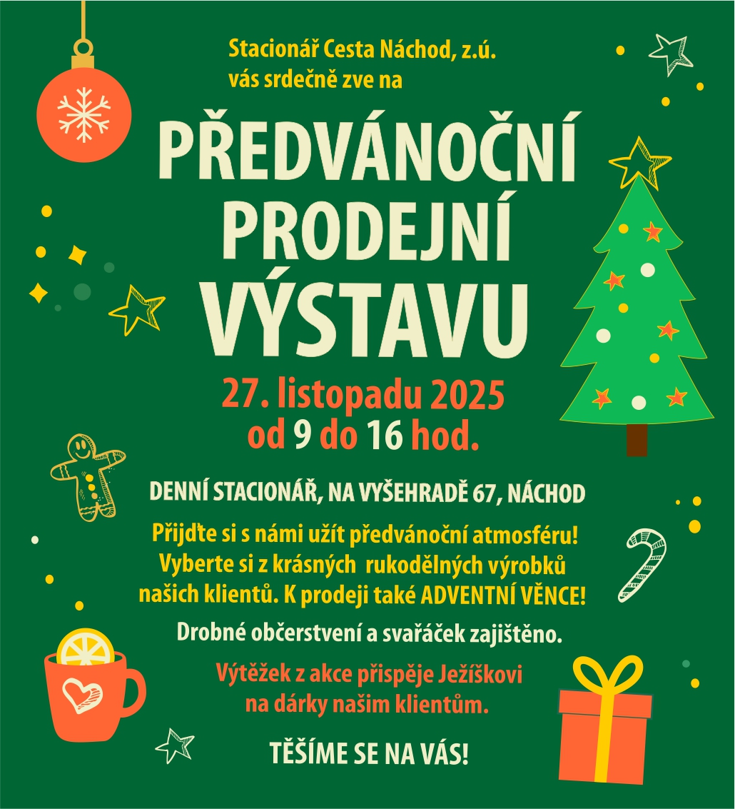 Stacionář Cesta Náchod, z. ú. vás srdečně zve na Předvánoční prodejní výstavu, která proběhne 27. listopadu 2025 od 9:00 do 16:00  v denním stacionáři (ul. Na Vyšehradě 67).