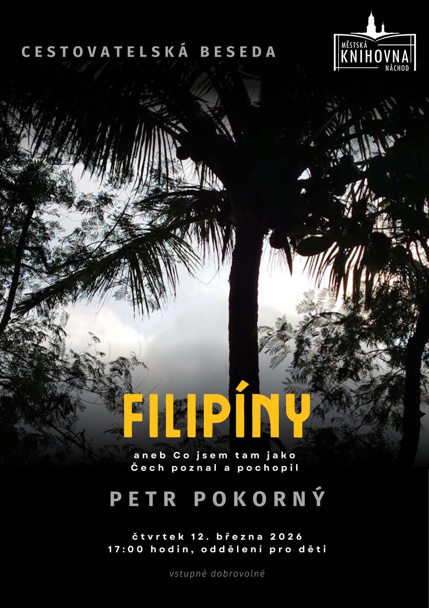 Městská knihovna Náchod vás zve 12. března 2026 od 17:00 hodin do dětského oddělení na cestovatelskou besedu Petra Pokorného, který se v květnu loňského roku zúčastnil mezinárodní konference ochránců přírody A Rocha na Filipínách.