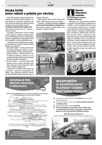 8 INFORMACE Z RADNICE N%u00c1CHODSK%u00dd ZPRAVODAJM%u011bstsk%u00e9informa%u010dn%u00edcentrumNEZAPOME%u0147TESI ZKONTROLOVATPLATNOST VA%u0160EHO%u0158IDI%u010cSK%u00c9HO PR%u016eKAZUO v%u00fdm%u011bnu je mo%u017en%u00e9 po%u017e%u00e1dat ji%u017e t%u0159i m%u011bs%u00edce p%u0159ed vypr%u0161en%u00edmplatnosti dokladu.P%u0159i pod%u00e1n%u00ed %u017e%u00e1dosti je nutn%u00e9 dolo%u017eit platn%u00fd doklad toto%u017enostia %u0159idi%u010dsk%u00fd pr%u016fkaz.Nov%u00fd doklad bude vystaven do 20 dn%u016f.Pokud nepo%u017e%u00e1d%u00e1te o nov%u00fd doklad v%u010das a budete %u0159%u00edditi po uplynut%u00ed jeho platnosti, vystavujete se finan%u010dn%u00edmupostihu za %u0159%u00edzen%u00ed bez platn%u00e9ho %u0159idi%u010dsk%u00e9ho pr%u016fkazu.Dal%u0161%u00ed informace naleznete na:https://mestonachod.cz/potrebuji-zaridit/doprava/registr-ridicu/NEZAPOME%u0147TESI ZKONTROLOVATPLATNOST VA%u0160EHO%u0158IDI%u010cSK%u00c9HO PR%u016eKAZUO v%u00fdm%u011bnu je mo%u017en%u00e9 po%u017e%u00e1dat ji%u017e t%u0159i m%u011bs%u00edce p%u0159ed vypr%u0161en%u00edmplatnosti dokladu.P%u0159i pod%u00e1n%u00ed %u017e%u00e1dosti je nutn%u00e9 dolo%u017eit platn%u00fd doklad toto%u017enostia %u0159idi%u010dsk%u00fd pr%u016fkaz.Nov%u00fd doklad bude vystaven do 20 dn%u016f.Pokud nepo%u017e%u00e1d%u00e1te o nov%u00fd doklad v%u010das a budete %u0159%u00edditi po uplynut%u00ed jeho platnosti, vystavujete se finan%u010dn%u00edmupostihu za %u0159%u00edzen%u00ed bez platn%u00e9ho %u0159idi%u010dsk%u00e9ho pr%u016fkazu.%u0158IDI%u010cSK%u00c9HO PR%u016eKAZUNa%u0161e m%u011bsto nab%u00edz%u00ed venkovn%u00ed h%u0159i%u0161t%u011b a posilovny pro v%u0161echny v%u011bkov%u00e9 kategorie, zaryt%u00e9 sportovce i milovn%u00edky parkouru a fi tness, kter%u00e1 jsou ide%u00e1ln%u00ed pro aktivn%u00ed tr%u00e1ven%u00ed voln%u00e9ho %u010dasu na %u010derstv%u00e9m vzduchu. Kompletn%u00ed p%u0159ehled h%u0159i%u0161%u0165 najdete zde:https://www.mestonachod.cz/.../kultura.../venkovni-hriste/Stoupaj%u00edc%u00ed n%u00e1v%u0161t%u011bvnost t%u011bchto lokalit s sebou p%u0159in%u00e1%u0161%u00ed i negativn%u00ed dopady. Bohu%u017eel se na n%u011bkter%u00fdch m%u00edstech v N%u00e1chod%u011b pot%u00fdk%u00e1me s nepo%u0159%u00e1dkem, nevhodn%u00fdm chov%u00e1n%u00edm dosp%u011bl%u00fdch i voln%u011b pob%u00edhaj%u00edc%u00edmi psy. Abychom zachovali p%u0159%u00edjemn%u00e9 a bezpe%u010dn%u00e9 prost%u0159ed%u00ed pro v%u0161echny, p%u0159ij%u00edm%u00e1 m%u011bsto N%u00e1chod tato opat%u0159en%u00ed: Mimo%u0159%u00e1dn%u00fd %u00faklid %u2013 v%u0161echna d%u011btsk%u00e1 h%u0159i%u0161t%u011b projdou d%u016fkladn%u00fdm %u00faklidem, odstran%u00edme odpadky, st%u0159epy i jin%u00e9 ne%u010distoty. Pos%u00edlen%u00ed kontrol %u2013 m%u011bstsk%u00e1 policie zv%u00fd%u0161%u00ed dohled na h%u0159i%u0161t%u00edch, zam%u011b%u0159%u00ed se na nejproblemati%u010dt%u011bj%u0161%u00ed lokality a bude d%u016fsledn%u011b %u0159e%u0161it poru%u0161ov%u00e1n%u00ed po%u0159%u00e1dku. Jasn%u00e1 pravidla %u2013 provozn%u00ed %u0159%u00e1dy h%u0159i%u0161%u0165 projdou reviz%u00ed a budou viditeln%u011b vyv%u011b%u0161eny. Zd%u016frazn%u00ed z%u00e1kaz konzumace alkoholu a voln%u00e9ho pohybu ps%u016f. Bezpe%u010dnost a po%u0159%u00e1dek v%u0161ak nejsou jen v%u011bc%u00ed m%u011bsta %u2013 kl%u00ed%u010dov%u00e1 je ohleduplnost ka%u017ed%u00e9ho z n%u00e1s. Spole%u010dn%u011b m%u016f%u017eeme zajistit, aby d%u011btsk%u00e1 h%u0159i%u0161t%u011b z%u016fstala m%u00edstem, kam se D%u011btsk%u00e1 h%u0159i%u0161t%u011bm%u00edsto radosti a pohybu pro v%u0161echnyv%u0161ichni r%u00e1di vrac%u00ed. M%u00e1te podn%u011bt nebo n%u00e1vrh? Dejte n%u00e1m v%u011bd%u011bt. Va%u0161e n%u00e1zory jsou pro n%u00e1s cenn%u00e9! St%u00e1hn%u011bte si aplikaci Munipolis https://mestonachod.munipolis.cz/registrace, kde m%u016f%u017eete snadno a rychle odeslat sv%u016fj podn%u011bt %u010di nahl%u00e1sit z%u00e1vadu. Nov%u00e9 n%u00e1chodsk%u00e9 suven%u00fdry v nab%u00eddce infocenterInfocentra na Masarykov%u011b n%u00e1m%u011bst%u00ed a v Mal%u00fdch l%u00e1zn%u00edch B%u011bloves roz%u0161%u00ed%u0159ila svou nab%u00eddku o ru%u010dn%u011b vyr%u00e1b%u011bn%u00e9 bylinn%u00e9 sirupy z %u010dist%u00e9 p%u0159%u00edrody Orlick%u00fdch hor s origin%u00e1ln%u00edmi etiketami s motivy N%u00e1choda. Ochutnejte sirupy z medu%u0148ky, mate%u0159%u00eddou%u0161ky, bezu, levandule a dal%u0161%u00edch bylin, kter%u00e9 pot%u011b%u0161%u00ed va%u0161e t%u011blo i du%u0161i. V infocentru v Mal%u00fdch l%u00e1zn%u00edch nyn%u00ed tak%u00e9 najdete elegantn%u00ed p%u00edtka na miner%u00e1ln%u00ed vodu s motivem L%u00e1zn%u00ed B%u011bloves. Stylov%u00fd dopln%u011bk pro ka%u017ed%u00e9ho, kdo si chce vychutnat l%u00e9%u010divou vodu s noblesou! A%u0165 u%u017e jste pravideln%u00fdm n%u00e1v%u0161t%u011bvn%u00edkem, nebo si chcete odn%u00e9st kousek l%u00e1ze%u0148sk%u00e9 atmosf%u00e9ry dom%u016f, tato p%u00edtka jsou skv%u011blou volbou.