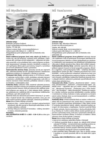 DUBEN MATE%u0158SK%u00c9 %u0160KOLY 15* * *M%u0160 MyslbekovaZ%u00e1kladn%u00ed %u00fadaje:%u0158editelka: Jaroslava Du%u0161kov%u00e1E-mail: msmyslbekova@msmyslbekova.czTelefon: 775 240 426Webov%u00e9 str%u00e1nky %u0161koly: www.msmyslbekova.czCelkov%u00fd po%u010det d%u011bt%u00ed %u0161koly k 31. 1. 2025: 90P%u0159edpokl%u00e1dan%u00fd po%u010det p%u0159ij%u00edman%u00fdch d%u011bt%u00ed od %u0161koln%u00edho roku 2025/26: 28%u0160koln%u00ed vzd%u011bl%u00e1vac%u00ed program: Zem%u011b, voda, vzduch a j%u00e1, %u010dlov%u011bk je vytvo%u0159en tak, aby byl kreativn%u00ed, vych%u00e1zel vst%u0159%u00edc pot%u0159eb%u00e1m i odli%u0161nostem d%u011bt%u00ed, po%u010d%u00ednaje od t%u011bch nejmen%u0161%u00edch %u2013 odpout%u00e1n%u00ed od rodinn%u00e9ho prost%u0159ed%u00ed, a%u017e po p%u0159ed%u0161koln%u00ed d%u011bti a jejich p%u0159%u00edpravu na %u0161kolu, tedy samostatnost; rozvojem citov%u00fdch, soci%u00e1ln%u00edch a voln%u00edch vazeb zaji%u0161%u0165ujeme d%u011btem jejich pocit jistoty, bezpe%u010d%u00ed a vytv%u00e1%u0159%u00edme pro n%u011b nov%u00e9 p%u0159%u00edle%u017eitosti k u%u010den%u00ed a pozn%u00e1v%u00e1n%u00ed.Nadstandardn%u00ed aktivity %u0161koly: plaveck%u00fd v%u00fdcvik pro nejstar%u0161%u00ed d%u011bti, nab%u00edz%u00edme ly%u017ea%u0159sk%u00fd v%u00fdcvik v Jansk%u00fdch l%u00e1zn%u00edch a v%u0161eobecnou pohybovou pr%u016fpravu ve spolupr%u00e1ci s Bav%u00edme se sportem.V%u00fdznamn%u00e9 akce %u0161koly: spolupracujeme se Z%u0160 Drtinovo n%u00e1m%u011bst%u00ed, nab%u00edz%u00edme tvo%u0159iv%u00e9 d%u00edlny s rodi%u010di, po%u0159%u00e1d%u00e1me zahradn%u00ed slavnost s lou%u010den%u00edm s p%u0159ed%u0161kol%u00e1ky s bohat%u00fdm programem; na%u0161e d%u011bti se %u00fa%u010dastn%u00ed slavnosti v%u00edt%u00e1n%u00ed ob%u010d%u00e1nk%u016f; po%u0159%u00e1d%u00e1me exkurse a v%u00fdlety do bl%u00edzk%u00e9ho i vzd%u00e1len%u011bj%u0161%u00edho okol%u00ed.Podm%u00ednky %u0161koly: nab%u00edz%u00edme velk%u00e9, modern%u011b vybaven%u00e9 prostory s kr%u00e1snou zahradou ur%u010denou pro pohybov%u00e9 aktivity, p%u011bstitelsk%u00e9 a polytechnick%u00e9 %u010dinnosti; t%u0159%u00edda pro nejstar%u0161%u00ed d%u011bti zaji%u0161%u0165uje intenzivn%u00ed p%u0159%u00edpravu pro n%u00e1stup do 1. t%u0159%u00eddy z%u00e1kladn%u00ed %u0161koly; zaji%u0161%u0165ujeme podm%u00ednky pro vzd%u011bl%u00e1v%u00e1n%u00ed d%u011bt%u00ed se speci%u00e1ln%u00edmi vzd%u011bl%u00e1vac%u00edmi pot%u0159ebami a pro d%u011bti mlad%u0161%u00ed t%u0159%u00ed let.Mate%u0159sk%u00e1 %u0161kola m%u00e1 odlou%u010den%u00e9 pracovi%u0161t%u011b U Ko%u010dovny 31. Je um%u00edst%u011bno v budov%u011b b%u00fdval%u00e9 vily v klidn%u00e9m prost%u0159ed%u00ed u lesa; pro sv%u00e9 mal%u00e9 vnit%u0159n%u00ed prostory p%u016fsob%u00ed rodinn%u00fdm, dom%u00e1c%u00edm prost%u0159ed%u00edm.R%u016fzn%u00e9 (%u010d%u00edm se %u0161kola odli%u0161uje od jin%u00fdch): venkovn%u00ed t%u0159%u00edda %u2013 tvo%u0159iv%u00e1 d%u00edlna pro rozv%u00edjen%u00ed polytechnick%u00fdch dovednost%u00ed, kde d%u011bti pracuj%u00ed se skute%u010dn%u00fdm materi%u00e1lem, se skute%u010dn%u00fdm n%u00e1%u0159ad%u00edm a n%u00e1%u010din%u00edmv%u0161echny t%u0159%u00eddy jsou vybaveny IT technikou %u2013 tablety, interaktivn%u00ed tabule, robotick%u00e9 pom%u016fckyPozv%u00e1nka:DEN OTEV%u0158EN%u00ddCH DVE%u0158%u00cd 17. 4. 2025 %u2013 9.30%u201311.30 na obou pracovi%u0161t%u00edch.M%u0160 Van%u010durovaZ%u00e1kladn%u00ed %u00fadaje:%u0158editelka: Mgr. Miroslava Weissov%u00e1 E-mail: ms.vancurova@post.czTelefon: 491 428 695Webov%u00e9 str%u00e1nky %u0161koly: www.msnachod.czCelkov%u00fd po%u010det d%u011bt%u00ed %u0161koly k 31. 1. 2025: 63P%u0159edpokl%u00e1dan%u00fd po%u010det p%u0159ij%u00edman%u00fdch d%u011bt%u00ed od %u0161koln%u00edho roku 2025/2026: 20%u0160koln%u00ed vzd%u011bl%u00e1vac%u00ed program: Strom p%u0159%u00e1telstv%u00ed zahrnuje obecn%u00e9 c%u00edle vzd%u011bl%u00e1v%u00e1n%u00ed a %u0159%u00edd%u00ed se spole%u010dn%u00fdmi c%u00edli (osvojen%u00ed z%u00e1kladn%u00edch kl%u00ed%u010dov%u00fdch kompetenc%u00ed d%u00edt%u011btem a z%u00edsk%u00e1n%u00ed p%u0159edpoklad%u016f pro celo%u017eivotn%u00ed vzd%u011bl%u00e1v%u00e1n%u00ed), nen%u00ed opomenuto ani p%u0159ihl%u00e9dnut%u00ed k p%u0159ed%u0161koln%u00edmu v%u011bku jako k obdob%u00ed senzitivn%u00ed f%u00e1ze, kdy je d%u00edt%u011b zvl%u00e1%u0161t%u011b vn%u00edmav%u00e9. Nadstandardn%u00ed aktivity %u0161koly: nab%u00edz%u00edme nejstar%u0161%u00edm d%u011btem dopl%u0148kov%u00e9 z%u00e1jmov%u00e9 %u010dinnosti ve form%u011b nespav%u00e9ho programu: fl%u00e9tni%u010dka a angli%u010dtina, nov%u011b poskytujeme VOKS %u2013 v%u00fdm%u011bnn%u00fd obr%u00e1zkov%u00fd komunika%u010dn%u00ed syst%u00e9m pro d%u011bti s v%u00e1%u017en%u00fdmi poruchami %u0159e%u010di a kurz ELKONIN %u2013 rozvoj jazykov%u00fdch schopnost%u00ed, p%u0159%u00edprava na %u010dten%u00ed, pro d%u011bti mlad%u0161%u00ed je tak%u00e9 p%u0159ipravov%u00e1n nespav%u00fd program ve form%u011b klidov%u00fdch %u010dinnost%u00ed; p%u0159ed%u0161kol%u00e1ci ka%u017edoro%u010dn%u011b absolvuj%u00ed plaveck%u00fd kurz, v p%u0159%u00edpad%u011b dobr%u00fdch sn%u011bhov%u00fdch podm%u00ednek zprost%u0159edkov%u00e1v%u00e1 mate%u0159sk%u00e1 %u0161kola ly%u017ea%u0159sk%u00fd kurz.V%u00fdznamn%u00e9 akce %u0161koly: Projekty: %u201eBramborov%u00fd t%u00fdden%u201c %u2013 zakon%u010den%u00fd %u201eBrambori%u00e1dou%u201c, %u201eD%u00fd%u0148ov%u00e1n%u00ed%u201c, %u201eSvatomartinsk%u00fd t%u00fdden%u201c %u201eAnd%u011blsk%u00e1 cesta%u201c %u2013 odpoledn%u00ed akce pro rodi%u010de s d%u011btmi, %u201e%u010certovsk%u00fd rej%u201c, %u201eMasopustn%u00ed karneval%u201c, %u201eProbouzen%u00ed jara s v%u00edlou Evel%u00ednkou%u201c, %u201eRej %u010darod%u011bjnic%u201c, %u201eMal%u00fd zahradn%u00ed%u010dek%u201c, bes%u00eddka pro maminky s jarn%u00edm tvo%u0159en%u00edm, pasov%u00e1n%u00ed p%u0159ed%u0161kol%u00e1k%u016f a mnoho dal%u0161%u00edho v souvislosti se