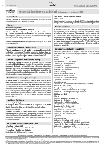 32 KNIHOVNA N%u00c1CHODSK%u00dd ZPRAVODAJPro aktu%u00e1ln%u00ed informace sledujte na%u0161e str%u00e1nky www.mknachod.cz nebo www.facebook.com/knihovnanachod.M%u011bstsk%u00e1 knihovna N%u00e1chod informuje v dubnu 2025M%u011bs%u00ed%u010dn%u00edk N%u00e1chodsk%u00fd zpravodaj. Vyd%u00e1v%u00e1 M%u011bsto N%u00e1chod, I%u010cO: 00272868, Masarykovo n%u00e1m%u011bst%u00ed 40, 547 01 N%u00e1chod. Odpov%u011bdn%u00fd redaktor: Nina Adlof. Redak%u010dn%u00ed rada: Ing. Jaroslav Rohul%u00e1n, Ing. Eva %u010cejchanov%u00e1, Hana Kopeck%u00e1, Bc. Martin Hurd%u00e1lek, Petr B%u0159enda a Mgr. V%u011bra Vl%u010dkov%u00e1. Fotografi e po%u0159%u00eddila redakce, auto%u0159i %u010dl%u00e1nk%u016f a archiv. Tituln%u00ed foto: Martin Hurd%u00e1lek. Grafi ck%u00e1 %u00faprava CREOPRESS.%u010c%u00edslo 4/2025 vych%u00e1z%u00ed 1. 4. 2025. N%u00e1klad 5000 ks. Distribuce zdarma. Registrace: MK %u010cR E 11975. Za zm%u011bny v programech zodpov%u00eddaj%u00ed po%u0159adatel%u00e9 jednotliv%u00fdch akc%u00ed a po%u0159ad%u016f. P%u0159%u00edsp%u011bvky jsou v%u00edt%u00e1ny, nevy%u017e%u00e1dan%u00e9 se nevracej%u00ed. Neozna%u010den%u00e9 a nepodepsan%u00e9 p%u0159%u00edsp%u011bvky po%u0159%u00eddila redakce. Adresa %u010dasopisu: NZ, M%u011bstsk%u00fd %u00fa%u0159ad v N%u00e1chod%u011b, Masarykovo n%u00e1m%u011bst%u00ed 40, 547 01 N%u00e1chod, tel./fax: 491 405 255, e-mail: zpravodaj@mestonachod.cz. Uz%u00e1v%u011brka tohoto %u010d%u00edsla byla 16. 3. 2025. Uz%u00e1v%u011brka kv%u011btnov%u00e9ho %u010d%u00edsla bude 17. 4. 2025. Pros%u00edme o respektov%u00e1n%u00ed data uz%u00e1v%u011brky. D%u011bkujeme.Rozvoz knihV %u00fater%u00fd 8. dubna se v dopoledn%u00edch hodin%u00e1ch uskute%u010dn%u00ed rozvoz knih nemocn%u00fdm nebo star%u0161%u00edm ob%u010dan%u016fm.V%u00fdstavyStudovna a vstupn%u00ed halaPROUDEM DOBY. PETR SAMEK. OBRAZY.2. dubna %u2013 30. dubna. V%u00fdstavu prac%u00ed Petra Samka zah%u00e1j%u00edme v %u00fater%u00fd 1. dubna v 17.00 hodin ve studovn%u011b. Na vernis%u00e1%u017ei vystoup%u00ed dv%u011b %u017e%u00e1kyn%u011b L. Janka ze ZU%u0160 N%u00e1chod, kter%u00e9 za klav%u00edrn%u00edho doprovodu M. Linharta zahraj%u00ed na housle. Komentovan%u00e9 prohl%u00eddky budou prob%u00edhat v %u00fater%u00fd 15. a 29. dubna od 16.00 hodin.Virtu%u00e1ln%u00ed univerzita t%u0159et%u00edho v%u011bkuV %u00fater%u00fd 8. dubna n%u00e1s od 9.15 hodin ve studovn%u011b %u010dek%u00e1 posledn%u00ed p%u0159edn%u00e1%u0161ka 14. semestru Virtu%u00e1ln%u00ed univerzity t%u0159et%u00edho v%u011bku, pro kter%u00fd jsme vybrali cyklus p%u0159edn%u00e1%u0161ek %u010cesk%u00e9 d%u011bjiny a jejich souvislosti, j%u00edm%u017e n%u00e1s prov%u00e1z%u00ed prof. PhDr. Zden%u011bk Bene%u0161, CSc.Gambie %u2013 nejmen%u0161%u00ed zem%u011b %u010dern%u00e9 Afriky Ve st%u0159edu 16. dubna zav%u00edt%u00e1me v 17.30 hodin s atypick%u00fdm cestovatelem Ji%u0159%u00edm Kafkou do Gambie. Sv%u00fdm osobit%u00fdm zp%u016fsobem n%u00e1s zavede do jedn%u00e9 z nejchud%u0161%u00edch zem%u00ed sv%u011bta mezi m%u00edstn%u00ed dobrosrde%u010dn%u00e9 obyvatele. Ochutn%u00e1me tamn%u00ed j%u00eddlo, poplujeme po %u0159ece Gambii, uvid%u00edme opice, a dokonce si pohlad%u00edme krokod%u00fdla. Nav%u0161t%u00edv%u00edme i sousedn%u00ed Senegal a bude toho je%u0161t%u011b mnohem v%u00edc. Odd%u011blen%u00ed pro d%u011bti, vstupn%u00e9 dobrovoln%u00e9.Muzikoterapie nejen pro senioryA%u017e do 24. dubna se budeme ka%u017ed%u00fd %u010dtvrtek od 9.30 do 11.00 hodin sch%u00e1zet ve studovn%u011b, kde pomoc%u00ed hudebn%u00edch her op%u011bt aktivizujeme t%u011blo a mysl. Pod veden%u00edm Mgr. Pavl%u00edny Prudilov%u00e9 budeme zp%u00edvat p%u0159edev%u0161%u00edm %u010desk%u00e9 a moravsk%u00e9 lidov%u00e9 nebo popul%u00e1rn%u00ed p%u00edsn%u011b. V%u0161echny aktivity v r%u00e1mci setk%u00e1n%u00ed jsou dobrovoln%u00e9 %u2013 sami si ur%u010d%u00edte, do %u010deho se pust%u00edte. Chcete opr%u00e1%u0161it sv%u016fj hudebn%u00ed n%u00e1stroj, kter%u00fd jste u%u017e mnoho let nepou%u017eili? Pot%u0159ebujete si s n%u00e1mi jenom odpo%u010dinout, zaposlouchat se? I na v%u00e1s se t%u011b%u0161%u00edme. Vstupn%u00e9 na ka%u017edou lekci %u010din%u00ed 50 K%u010d.S kn%u00ed%u017ekou do %u017eivotaBookstart I (0%u20133 roky)Na %u00fater%u00fd 29. dubna chyst%u00e1me od 9.00 (1. skupina) a od 10.30 hodin (2. skupina) setk%u00e1n%u00ed pro d%u011bti do 3 let a jejich rodi%u010de. Bookstart II (3%u20136 let)V sobotu 26. dubna se v 9.00 hodin sejdou v d%u011btsk%u00e9m odd%u011blen%u00ed rodi%u010de a d%u011bti, pro kter%u00e9 op%u011bt nachyst%u00e1me program pln%u00fd %u010dten%u00ed, jednoduch%u00e9ho vyr%u00e1b%u011bn%u00ed a dal%u0161%u00edch z%u00e1bavn%u00fdch aktivit. Pros%u00edme o p%u0159ihl%u00e1%u0161en%u00ed na e-mail kobrlova@mknachod.cz nebo v d%u011btsk%u00e9m odd%u011blen%u00ed.N%u00e1chodsk%u00e1 univerzita voln%u00e9ho %u010dasu 7. dubna %u2013 Milan Z%u00e1li%u0161Hrady a z%u00e1mky severov%u00fdchodn%u00edch %u010cech IV.14. dubna %u2013 Bc. Martina Kolinsk%u00e1Marie Uchytilov%u00e1-Ku%u010dov%u00e1 a jej%u00ed tvorba 28. dubna %u2013 PhDr. Franti%u0161ek KadlecPra%u017esk%u00fd hradVstup je mo%u017en%u00fd pouze na pr%u016fkazky NUV%u010c, ostatn%u00ed z%u00e1jemci zaplat%u00ed po %u00fastn%u00ed dohod%u011b s organiz%u00e1tory jednor%u00e1zov%u00e9 vstupn%u00e9 70 K%u010d. P%u0159%u00edm%u011bstsk%u00fd t%u00e1borNa sv%u011bt%u011b je mnoho lid%u00ed, kte%u0159%u00ed n%u00e1s mohou inspirovat sv%u00fdm %u017eivotn%u00edm p%u0159%u00edb%u011bhem, sv%u00fdm %u0159emeslem, kon%u00ed%u010dkem, svou cestou. Leto%u0161n%u00ed knihovn%u00ed t%u00e1bor s n%u00e1zvem V%u0161%u00edm jsem byl r%u00e1d se ponese pr%u00e1v%u011b v tomto duchu. Bude pln%u00fd inspirac%u00ed, zaj%u00edmav%u00fdch lid%u00ed, m%u00edst, ale tak%u00e9 tvo%u0159en%u00ed, her a z%u00e1bavy. M%u00e1te d%u00edt%u011b ve v%u011bku 7%u201315 let a vyhovuje v%u00e1m term%u00edn 7.%u201311. %u010dervence? Tak nev%u00e1hejte a ozv%u011bte se n%u00e1m na e-mail
