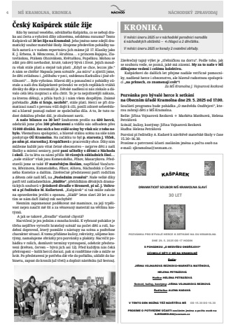 4 M%u0160 KRAMOLNA, KRONIKA N%u00c1CHODSK%u00dd ZPRAVODAJ KRONIKAV m%u011bs%u00edci %u00fanoru 2025 se v n%u00e1chodsk%u00e9 porodnici narodilo 6 n%u00e1chodsk%u00fdch ob%u010d%u00e1nk%u016f %u2013 4 chlapci a 2 d%u011bv%u010d%u00e1tka.V m%u011bs%u00edci %u00fanoru 2025 se konaly 2 svatebn%u00ed ob%u0159ady.DRAMATICK%u00dd SOUBOR M%u0160 KRAMOLNA SLAV%u00cd 30 LET POZV%u00c1NKA PRO B%u00ddVAL%u00c9 HERCE K SETK%u00c1N%u00cd NA OU KRAMOLNADNE 29. 5. 2025 OD 17 HODINS POH%u00c1DKOU %u201eO MEDV%u011aDU OND%u0158EJOVI%u201c%u00da%u010cINKUJ%u00cd D%u011aTI Z M%u0160 NA KRAMOLN%u011aRe%u017eie:JI%u0158INA VOJNAROV%u00c1 REZKOV%u00c1+MARK%u00c9TA MAT%u011aNOV%u00c1,HELENA PETR%u00c1%u0160OV%u00c1Hudba: HELENA PETR%u00c1%u0160OV%u00c1Sc%u00e9n%u00e1%u0159, kulisy, kost%u00fdmy: JI%u0158INA VOJNAROV%u00c1 REZKOV%u00c1%u0158editelka: ALENA KADAV%u00c1V TENTO DEN MO%u017dN%u00c1 T%u00c9%u017d N%u00c1V%u0160T%u011aVA M%u0160 OD 15.30 DO 16.30PROS%u00cdME O POTVRZEN%u00cd %u00da%u010cASTI zasl%u00e1n%u00edm jm%u00e9na a po%u010dtu osob na SJKRAMOLNA@seznam.czKdo by neznal vesel%u00e9ho, odv%u00e1%u017en%u00e9ho Ka%u0161p%u00e1rka, co se neboj%u00ed draka ani %u010derta a vyhr%u00e1v%u00e1 d%u00edky zdrav%u00e9mu, selsk%u00e9mu rozumu? Tento Ka%u0161p%u00e1rek u%u017e 30 let %u017eije na Kramoln%u011b. Jeho jm%u00e9no nese zdej%u0161%u00ed dramatick%u00fd soubor mate%u0159sk%u00e9 %u0161koly. Hrajeme p%u0159edev%u0161%u00edm poh%u00e1dky na%u0161ich autor%u016f a v na%u0161em reperto%u00e1ru jich m%u00e1me ji%u017e 17. Klasiky jako K. J. Erbena, B. N%u011bmcovou, F. Hrub%u00edna%u2026 s princem Bajajou, Zlatovl%u00e1skou, Pt%u00e1kem Ohniv%u00e1kem, Kv%u011btu%u0161kou, Popelkou. Mohou se zd%u00e1t pro d%u011bti nevhodn%u00e9, krut%u00e9, takov%u00fd b%u00fdv%u00e1 i %u017eivot. Jejich moudra v%u0161ak st%u00e1le plat%u00ed a stejn%u011b tak plat%u00ed: %u201eKdy%u017e se chce, leccos jde.%u201c A n%u00e1m se cht%u011blo! Napsala jsem sc%u00e9n%u00e1%u0159e %u201ena m%u00edru%u201c a zjistili jsme, %u017ee d%u011bti zvl%u00e1dnou i %u201eje%u017eibabu v peci, sn%u011bdenou Karkulku i jin%u00e9 obt%u00ed%u017enosti%u201c%u2026 Bylo vyhr%u00e1no. Hlavn%u00ed d%u011bj a ponau%u010den%u00ed z poh%u00e1dky z%u016fstalo a na%u0161i dva Ka%u0161p%u00e1rkov%u00e9-pr%u016fvodci ve sv%u00fdch replik%u00e1ch vt%u00e1hli div%u00e1ky do d%u011bje a rozesm%u00e1li je. D%u011btsk%u00e9 nad%u0161en%u00ed si n%u00e1s z%u00edskalo a d%u00e1valo cel%u00e1 l%u00e9ta inspiraci a s%u00edlu cht%u00edt. To je ta nejzdrav%u011bj%u0161%u00ed n%u00e1kaza, za kterou d%u011bkuji, a p%u0159%u00e1la bych ji i n%u00e1m v%u0161em dosp%u011bl%u00fdm. Zn%u00e1m%u00e9 po%u0159ekadlo %u201eKdo si hraje, nezlob%u00ed%u201c, st%u00e1le plat%u00ed. Herci se p%u0159i dramatizaci nau%u010d%u00ed s pevnou v%u016fl%u00ed doj%u00edt k c%u00edli, pos%u00edl%u00ed zdrav%u00e9 sebev%u011bdom%u00ed a hlavn%u011b poznaj%u00ed radost ze spole%u010dn%u00e9ho d%u00edla. A to, %u017ee tuto radost dok%u00e1%u017eou p%u0159edat d%u00e1l, je zku%u0161enost nav%u00edc. A na%u0161e bilance za 30 let? Souborem pro%u0161lo na 600 herc%u016f, odehr%u00e1li jsme p%u0159es 300 p%u0159edstaven%u00ed a vid%u011blo n%u00e1s odhadem p%u0159es 15 000 div%u00e1k%u016f. Bez nich a bez st%u00e1l%u00e9 sc%u00e9ny by v%u0161ak nic z toho nebylo. V%u0161emo%u017enou spolupr%u00e1ci, a hlavn%u011b st%u00e1lou sc%u00e9nu na s%u00e1le n%u00e1m poskytuje O%u00da Kramolna. Na za%u010d%u00e1tku to byl p. starosta J. Vl%u010dek, po n%u011bm p%u00ed. starostka J. Krop%u00e1%u010dkov%u00e1 s pracovn%u00edky obce. D%u00edky nim m%u016f%u017eeme ka%u017ed%u00e9 jaro v%u00edtat %u010detn%u00e9 obecenstvo %u2013 nejprve d%u011bti z na%u0161%u00ed %u0161kolky a m%u00edstn%u00ed seniory, pot%u00e9 pan%u00ed u%u010ditelky s d%u011btmi z N%u00e1choda i okol%u00ed. Za ta l%u00e9ta za n%u00e1mi p%u0159i%u0161lo 10 r%u016fzn%u00fdch z%u00e1kladn%u00edch %u0161kol%u2026 %u201ena%u0161e st%u00e1lice%u201c v%u0161ak jsou Komensk%u00e9ho, Plhov, Masarykova. P%u0159edstavili jsme se tak%u00e9 17 mate%u0159sk%u00fdm %u0161kol%u00e1m, nap%u0159%u00edklad Van%u010durova, B%u0159ezinova, Komensk%u00e9ho, Plhov, Al%u0161ova, N%u00e1chodsk%u00e1 z %u010cerven%u00e9ho Kostelce a dal%u0161%u00edm. Z%u00e1v%u011bre%u010dn%u00e9 p%u0159edstaven%u00ed pat%u0159%u00ed rodi%u010d%u016fm a d%u011btem cel%u00e9 na%u0161%u00ed M%u0160, na %u201ePosledn%u00edm zvon%u011bn%u00ed%u201c. Na%u0161e velk%u00e9 d%u00edky pat%u0159%u00ed t%u00e9%u017e zakladatelk%u00e1m %u201eH%u00e1d%u011bte%u201c, p%u0159ehl%u00eddk%u00e1m d%u011btsk%u00fdch dramatick%u00fdch soubor%u016f v Jir%u00e1skov%u011b divadle v Hronov%u011b, p%u00ed u%u010d. J. Voltrov%u00e9 a p%u00ed %u0159editelce M. Kollertov%u00e9. %u201eKa%u0161p%u00e1rek%u201c si tak m%u016f%u017ee zahr%u00e1t na opravdov%u00e9m jevi%u0161ti s oponou. %u201eH%u00e1d%u011b%u201c letos slav%u00ed 20 let a zat%u00edm se n%u00e1m da%u0159%u00ed %u017e%u00e1dn%u00fd rok nechyb%u011bt! Nesm%u00edm zapomenout pod%u011bkovat m%u00e9 mamince, za jej%u00ed trp%u011blivost nejen nau%u010dit m%u011b %u0161%u00edt a za v%u011bnovan%u00fd materi%u00e1l na v%u011bt%u0161inu kost%u00fdm%u016f. A jak se takov%u00e9 %u201edivadlo%u201c vlastn%u011b chyst%u00e1?Nacvi%u010den%u00ed je jen jedn%u00edm z mnoha krok%u016f. K vybran%u00e9 poh%u00e1dce je t%u0159eba nejd%u0159%u00edve vytvo%u0159it hrateln%u00fd sc%u00e9n%u00e1%u0159 na po%u010det d%u011bt%u00ed a rol%u00ed, hudebn%u00ed doprovod, kter%u00fd pom%u016f%u017ee s n%u00e1stupy na sc%u00e9nu a podtrhne charakter situac%u00ed. K tomu p%u0159id%u00e1me kulisy, rekvizity, u%u0161ijeme kost%u00fdmy, namalujeme obr%u00e1zky pro pozv%u00e1nky a plak%u00e1ty. Nacvi%u010dit poh%u00e1dku v rol%u00edch, domluvit term%u00edny vystoupen%u00ed, odehr%u00e1t p%u0159edstaven%u00ed (kv%u011bten, %u010derven %u2013 b%u00fdv%u00e1 jich asi 12). P%u0159ed ka%u017ed%u00fdm n%u00e1s %u010dek%u00e1 p%u0159ekvapen%u00ed %u2013 kolik herc%u016f doraz%u00ed,