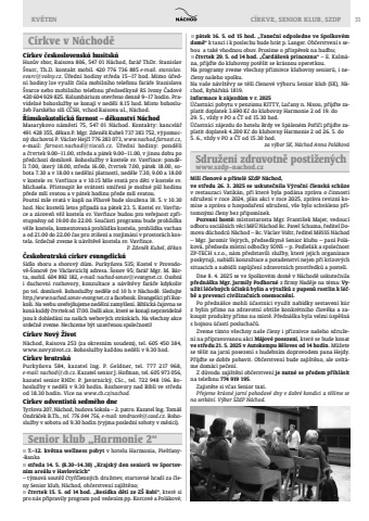 KV%u011aTEN C%u00cdRKVE, SENIOR KLUB, SZDP 31C%u00edrkve v N%u00e1chod%u011bC%u00edrkev %u010deskoslovensk%u00e1 husitsk%u00e1Hus%u016fv sbor, Raisova 806, 547 01 N%u00e1chod, far%u00e1%u0159 ThDr. Stanislav %u0160varc, Th.D. kontakt mobil. 420 776 736 885 e-mail. stanislav.svarc@volny.cz. %u00da%u0159edn%u00ed hodiny st%u0159eda 15%u201317 hod. Mimo %u00fa%u0159edn%u00ed hodiny lze vyu%u017e%u00edt %u010d%u00edsla mobiln%u00edho telefonu far%u00e1%u0159e Stanislava %u0160varce nebo mobiln%u00edho telefonu p%u0159edsedkyn%u011b RS Ivony %u010cadov%u00e9 420 604 929 825. Kolumb%u00e1rium otev%u0159eno denn%u011b 9%u201317 hodin. Pravideln%u00e9 bohoslu%u017eby se konaj%u00ed v ned%u011bli 8.15 hod. M%u00edsto bohoslu%u017eeb Farsk%u00e9ho s%u00ed%u0148 C%u010cSH, vchod Raisova ul., N%u00e1chod.%u0158%u00edmskokatolick%u00e1 farnost %u2013 d%u011bkanstv%u00ed N%u00e1chodMasarykovo n%u00e1m%u011bst%u00ed 75, 547 01 N%u00e1chod. Kontakty: kancel%u00e1%u0159 491 428 355, d%u011bkan P. Mgr. Zden%u011bk Kube%u0161 737 383 752, v%u00fdpomocn%u00fd duchovn%u00ed P. V%u00e1clav Hej%u010dl 776 283 073, www.nachod.farnost.cz, e-mail: farnost.nachod@tiscali.cz. %u00da%u0159edn%u00ed hodiny: pond%u011bl%u00ed a %u010dtvrtek 9.00%u201311.00, st%u0159eda a p%u00e1tek 9.00%u201311.00, v jinou dobu po p%u0159edchoz%u00ed domluv%u011b. Bohoslu%u017eby v kostele sv. Vav%u0159ince: pond%u011bl%u00ed 7.00, %u00fater%u00fd 18.00, st%u0159eda 16.00, %u010dtvrtek 7.00, p%u00e1tek 18.00, sobota 7.30 a v 18.00 s ned%u011bln%u00ed platnost%u00ed, ned%u011ble 7.30, 9.00 a 18.00 v kostele sv. Vav%u0159ince a v 10.15 M%u0161e svat%u00e1 pro d%u011bti v kostele sv. Michaela. P%u0159istoupit ke sv%u00e1tosti sm%u00ed%u0159en%u00ed je mo%u017en%u00e9 p%u016fl hodinu p%u0159ede m%u0161%u00ed svatou a v p%u00e1tek hodinu p%u0159ede m%u0161%u00ed svatou.Poutn%u00ed m%u0161e svat%u00e1 v kapli na Plhov%u011b bude slou%u017eena 18. 5. v 10.30 hod. Noc kostel%u016f letos p%u0159ipad%u00e1 na p%u00e1tek 23. 5. Kostel sv. Vav%u0159ince a z%u00e1rove%u0148 v%u011b%u017e kostela sv. Vav%u0159ince budou pro ve%u0159ejnost zp%u0159%u00edstupn%u011bny od 19.00 do 22.00. Sou%u010d%u00e1st%u00ed programu bude prohl%u00eddka v%u011b%u017ee kostela, komentovan%u00e1 prohl%u00eddka kostela, prohl%u00eddka varhan a od 21.00 do 22.00 %u010das pro zti%u0161en%u00ed a rozj%u00edm%u00e1n%u00ed v prostor%u00e1ch kostela. Srde%u010dn%u011b zveme k n%u00e1v%u0161t%u011bv%u011b kostela sv. Vav%u0159ince.  P. Zden%u011bk Kube%u0161, d%u011bkan%u010ceskobratrsk%u00e1 c%u00edrkev evangelick%u00e1S%u00eddlo sboru a sborov%u00fd d%u016fm. Purky%u0148ova 535; Kostel v Provodov%u011b-%u0160onov%u011b (ve V%u00e1clavic%u00edch) adresa. %u0160onov 95; far%u00e1%u0159 Mgr. M. B%u00e1rta, mobil. 604 892 182, e-mail: nachod-sonov@evangnet.cz. Osobn%u00ed i duchovn%u00ed rozhovory, konzultace a n%u00e1v%u0161t%u011bvy far%u00e1%u0159e kdykoliv po tel. domluv%u011b. Bohoslu%u017eby ned%u011ble od 10 h v N%u00e1chod%u011b. Sledujte http.//www.nachod.sonov-evangnet.cz a facebook. Evangel%u00edci p%u0159i Rozko%u0161i. Na webu uve%u0159ej%u0148ujeme ned%u011bln%u00ed zamy%u0161len%u00ed. Biblick%u00e1 %u010dajovna se kon%u00e1 ka%u017ed%u00fd %u010dtvrtek od 17.00. Dal%u0161%u00ed akce, kter%u00e9 se konaj%u00ed nepravideln%u011b jsou k dohled%u00e1n%u00ed na na%u0161ich webov%u00fdch str%u00e1nk%u00e1ch. Na v%u0161echny akce srde%u010dn%u011b zveme. Nechceme b%u00fdt uzav%u0159enou spole%u010dnost%u00ed! C%u00edrkev Nov%u00fd %u017divot N%u00e1chod, Raisova 253 (za okresn%u00edm soudem), tel. 605 450 384, www.novyzivot.cz. Bohoslu%u017eby ka%u017edou ned%u011bli v 9.30 hod.C%u00edrkev bratrsk%u00e1Purky%u0148ova 584, kazatel Ing. P. Geldner, tel. 777 217 968,e-mail: nachod@cb.cz. Kazatel senior J. Hofman, tel. 605 973 056, kazatel senior RNDr. P. Javornick%u00fd, CSc., tel. 722 948 196. Bohoslu%u017eby v ned%u011bli v 9.30 hodin. Rozhovory nad Bibl%u00ed ve st%u0159edu od 18.30 hodin. V%u00edce na www.cb.cz/nachod.C%u00edrkev adventist%u016f sedm%u00e9ho dneTyrs%u030cova 207, N%u00e1chod, budova Sokola %u2013 2. patro. Kazatel Ing. Tom%u00e1%u0161 Ondr%u00e1%u010dek B.Th., tel. 776 044 756, e-mail: tondracek@casd.cz. Bohosluz%u030cby v sobotu od 9.30 hodin (vyjma posledni%u0301 soboty v me%u030csi%u0301ci).Senior klub %u201eHarmonie 2%u201cSdru%u017een%u00ed zdravotn%u011b posti%u017een%u00fdchwww.szdp%u2013nachod.czp%u00e1tek 16. 5. od 15 hod. %u201eTane%u010dn%u00ed odpoledne ve Spolkov%u00e9m dom%u011b%u201c k tanci i k poslechu bude hr%u00e1t p. Langer. Ob%u010derstven%u00ed s sebou a tak%u00e9 vhodnou obuv. Pros%u00edme o p%u0159%u00edsp%u011bvek na hudbu;%u010dtvrtek 29. 5. od 14 hod. %u201e%u010card%u00e1%u0161ov%u00e1 princezna%u201c %u2013 E. Kalm%u00e1na, p%u0159ij%u010fte do klubovny pot%u011b%u0161it se kr%u00e1snou operetkou.Na programy zveme v%u0161echny p%u0159%u00edznivce klubovny senior%u016f, i ne%u010dleny na%u0161eho spolku.Na va%u0161e n%u00e1v%u0161t%u011bvy se t%u011b%u0161%u00ed %u010dlenov%u00e9 v%u00fdboru Senior klub (SK), N%u00e1chod, Ryb%u00e1%u0159sk%u00e1 1819.Informace k z%u00e1jezd%u016fm v r. 2025%u00da%u010dastn%u00edci pobytu v penzionu KITTY, Lu%u010dany n. Nisou, p%u0159ij%u010fte zaplatit doplatek 3.690 K%u010d do klubovny Harmonie 2 od 19. do 29. 5., v%u017edy v PO a %u010cT od 15.30 hod.%u00da%u010dastn%u00edci z%u00e1jezdu do hotelu Brdy ve Sp%u00e1len%u00e9m Po%u0159%u00ed%u010d%u00ed p%u0159ij%u010fte zaplatit doplatek 4.200 K%u010d do klubovny Harmonie 2 od 26. 5. do 5. 6., v%u017edy v PO a %u010cT od 15.30 hod.za v%u00fdbor SK, N%u00e1chod Anna Pol%u00e1kov%u00e17.%u201312. kv%u011btna wellness pobyt v hotelu Harmonia, Pie%u0161%u0165any--Bankast%u0159eda 14. 5. (8.30%u201314.30) %u201eKrajsk%u00fd den senior%u016f ve Sportovn%u00edm are%u00e1lu v Havlovic%u00edch%u201c%u2013 t%u00fdmov%u00e1 sout%u011b%u017e %u010dty%u0159%u010dlenn%u00fdch dru%u017estev, startovn%u00e9 hrad%u00ed za %u010dleny Senior klub, N%u00e1ch